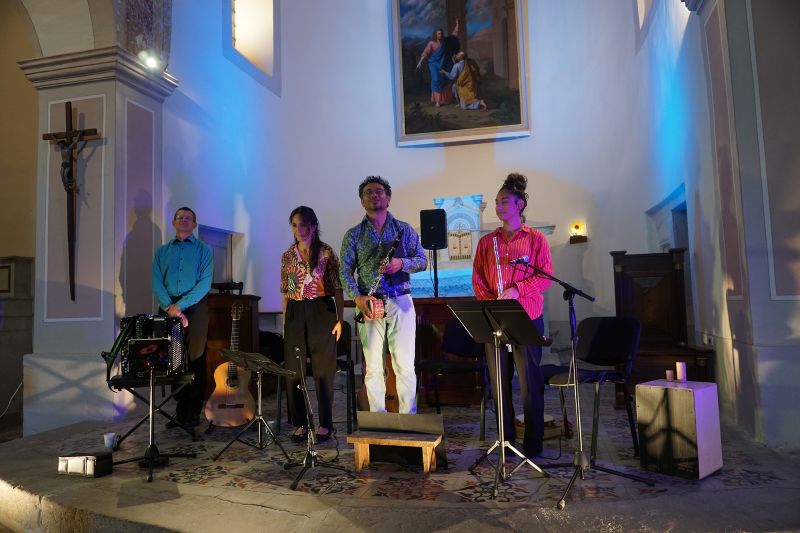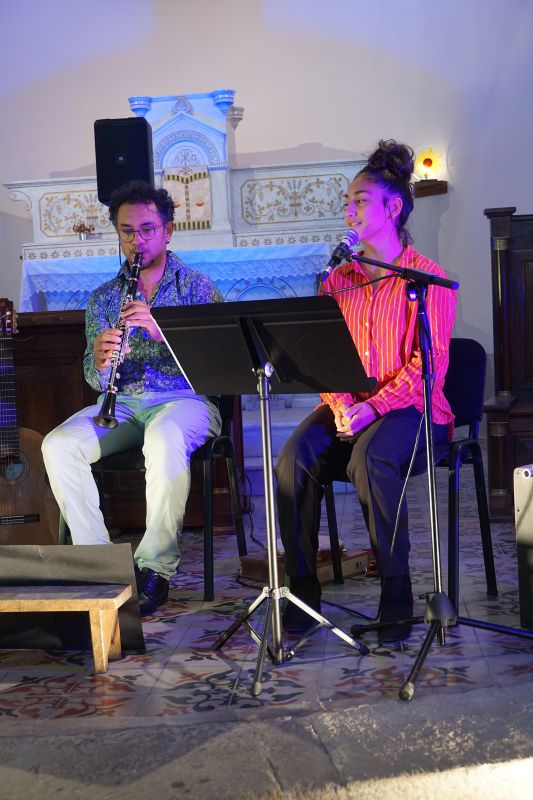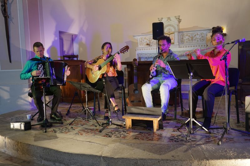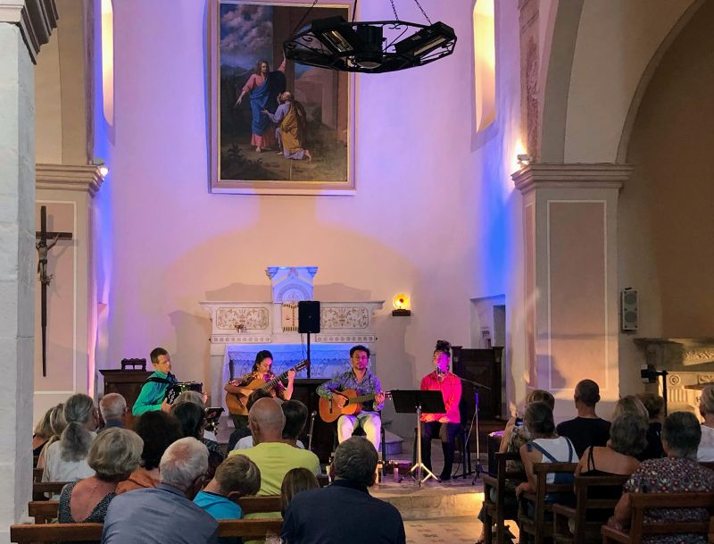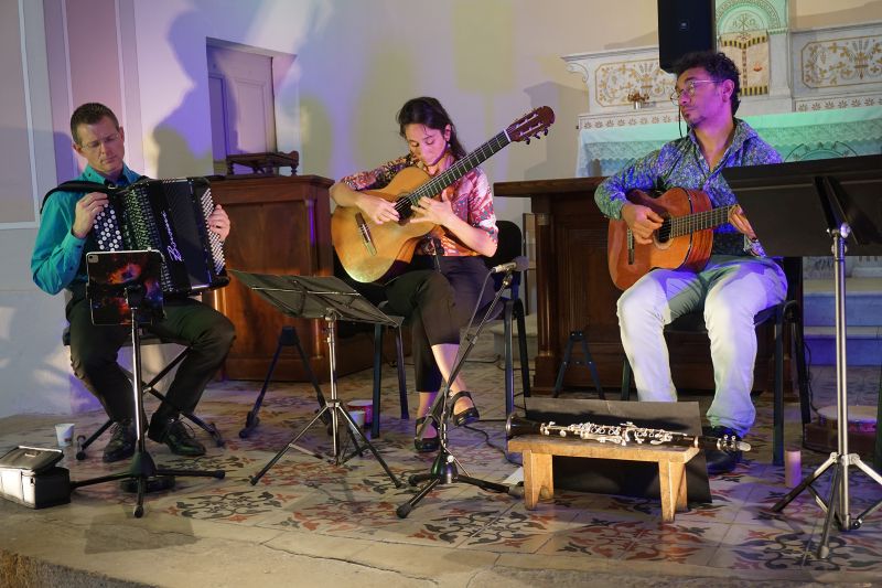 Dans l’église Saint-Pierre du village, le groupe musical Por Você (pour vous), a ravi le public présent, en jouant un doux mélange de musiques, sous influence brésilienne. Alison Pereira est brésilien, joue de la clarinette, du saxophone et Aimée Colomban-Pereira de la guitare et bien d’autres instruments. Ils forment un duo qui avec les années s’est mué en trio. Le couple est désormais régulièrement accompagné de leur fille aînée, Valentine. C’est une famille qui vit en musique. Au cours de la représentation musicale, Jérémy, musicien intervient dans le show en jouant parfaitement de l’accordéon ou de l’harmonica.
