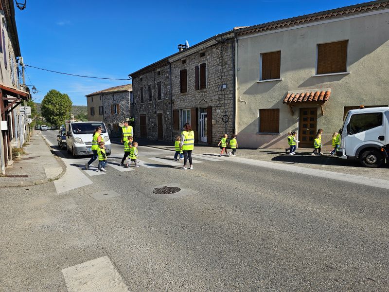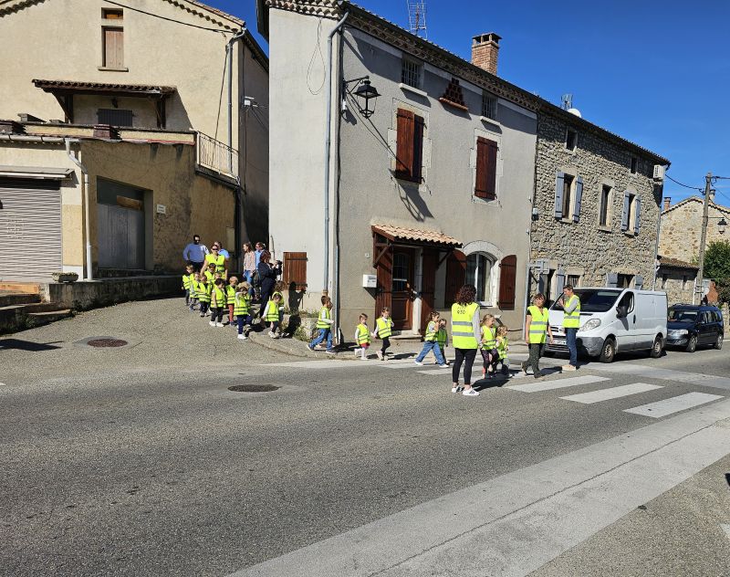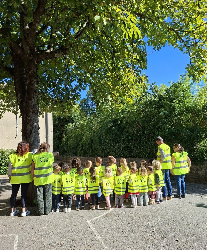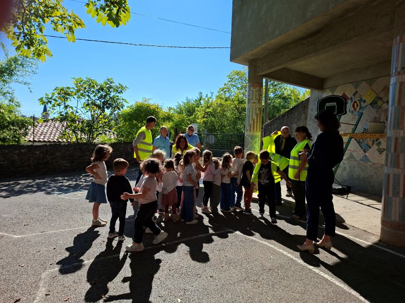 La classe maternelle/CP, très enthousiaste, a aussitôt revêtu le gilet pour faire une promenade jusqu’au village, bien encadrée par les enseignants, le personnel et le public présent.